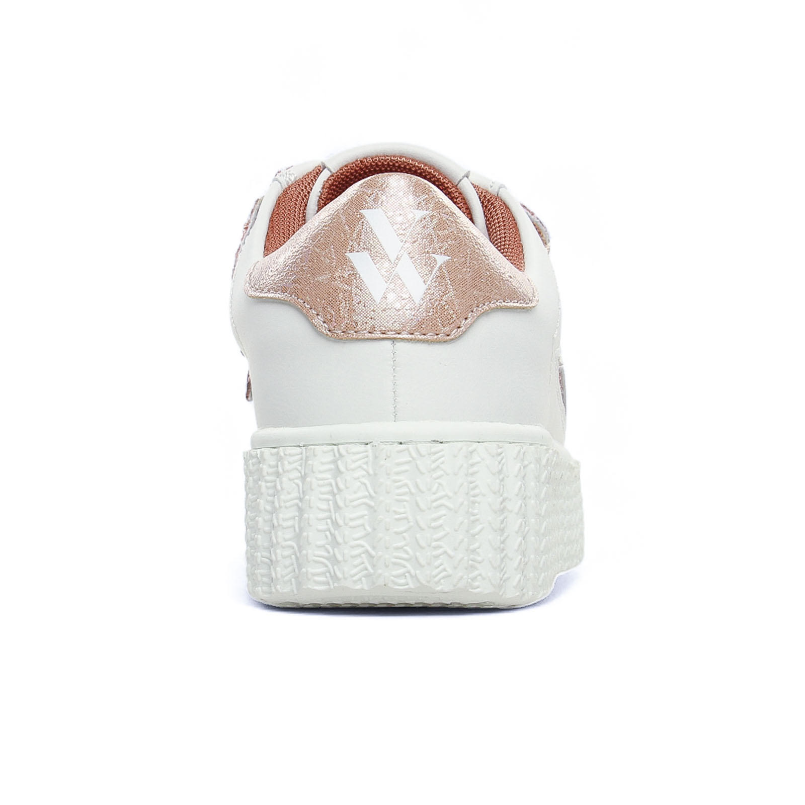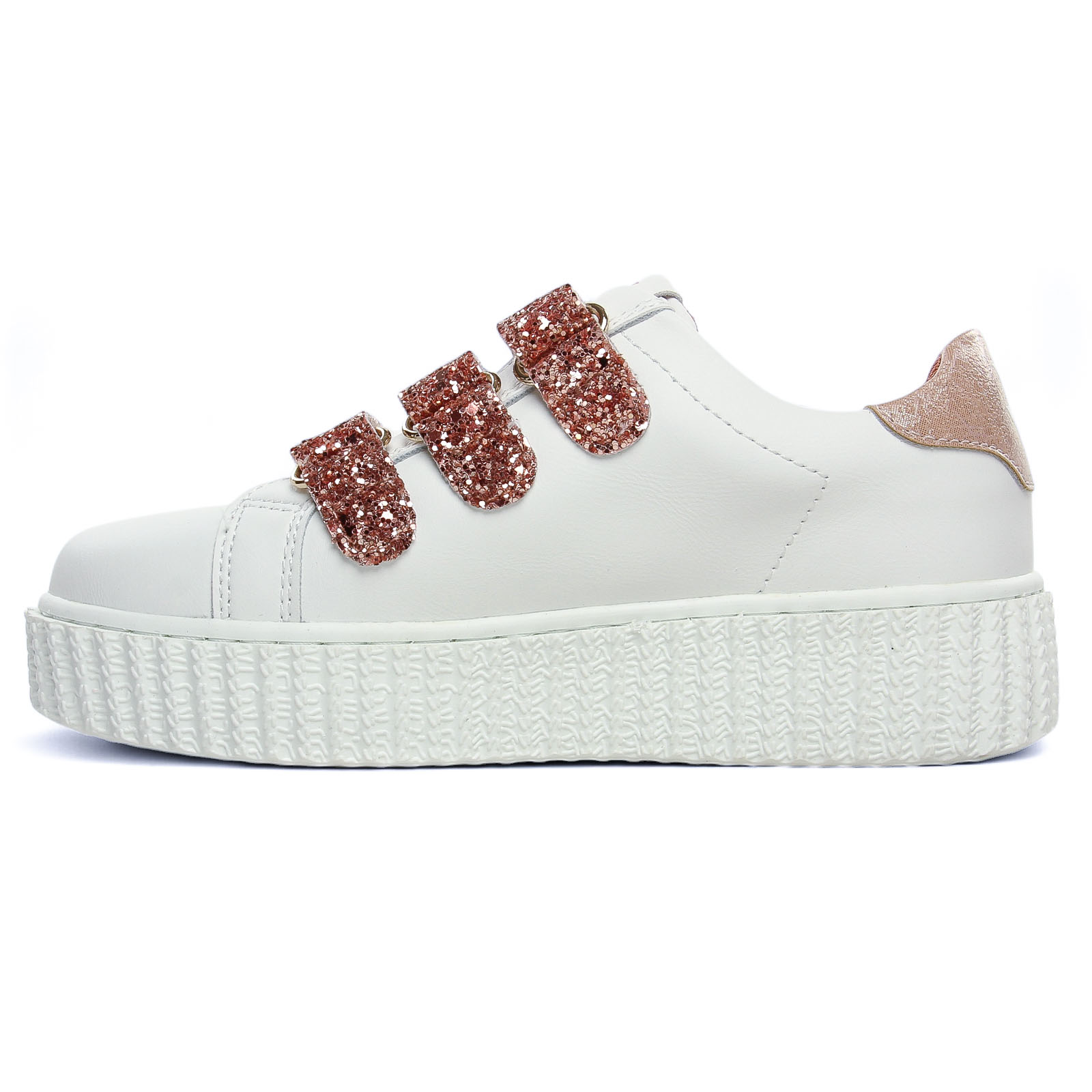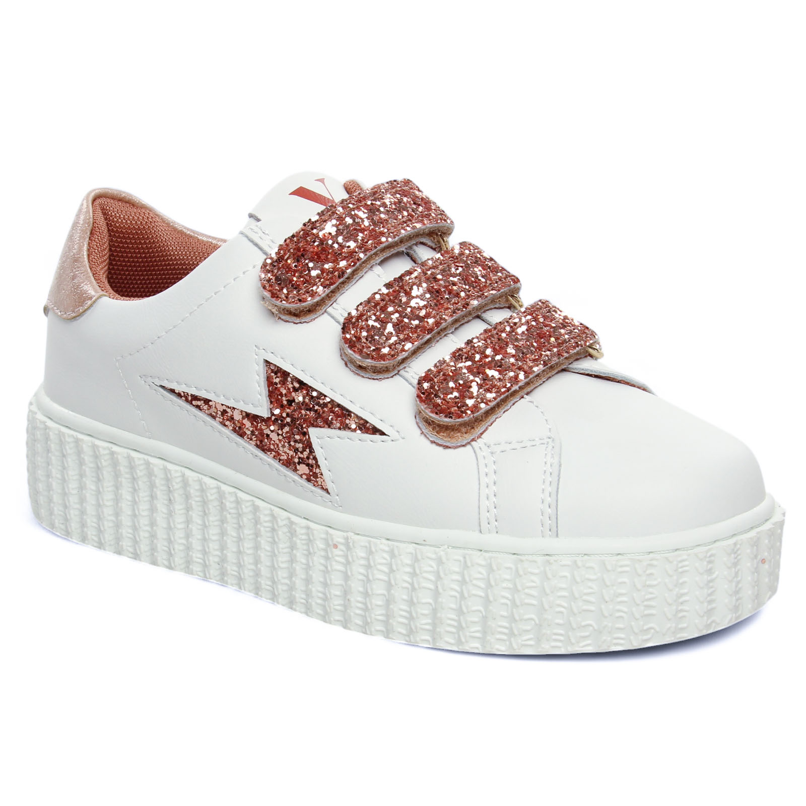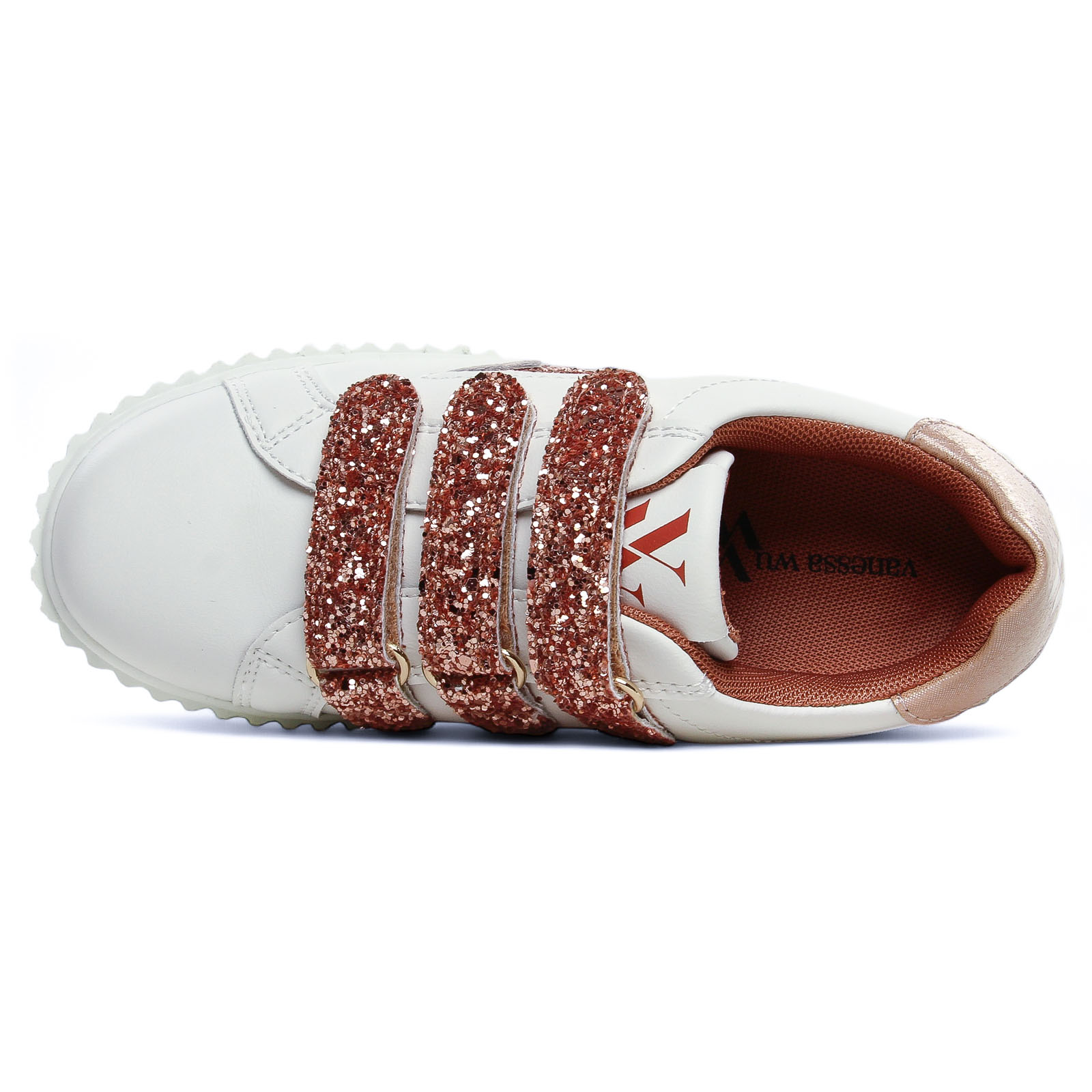 Baskets Enfants de la marque Vanessa Wu de couleur blanc or rose. Baskets éclair pour enfant signées Vanessa Wu, triple scratchs pailletés et semelle plateforme, deux versions disponibles une blanche et dorée et une autre blanche et argent.