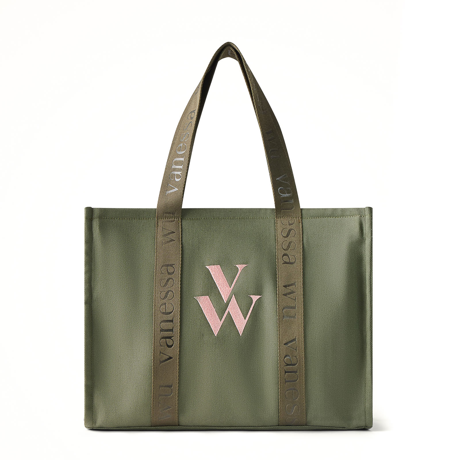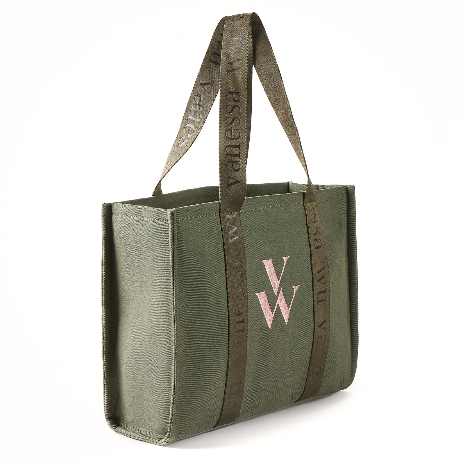 Sac À Main de la marque Vanessa Wu de couleur vert kaki. sac cabas Carla, un sac en tweed imprimé léopard ou vert kaki, agrémenté d'un monogramme brodé orange vif qui apporte une touche d'audace colorée. Les passepoils coordonnés et le fond rigide en tweed renforcent sa structure et son allure sophistiquée, tandis que les anses en tissu noir débordantes avec monogramme embossé ajoutent une signature distinctive. Doté d'une poche intérieure zippée, ce sac allie style sauvage, fonctionnalité et sophistication pour un look affirmé.