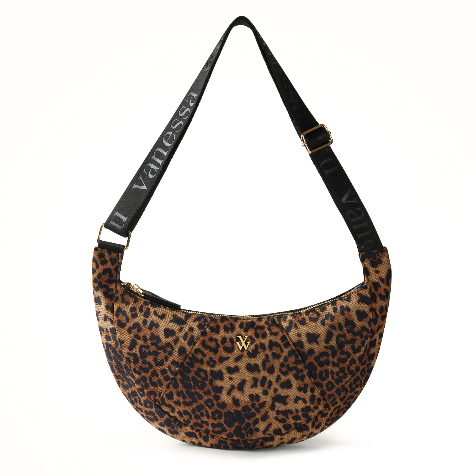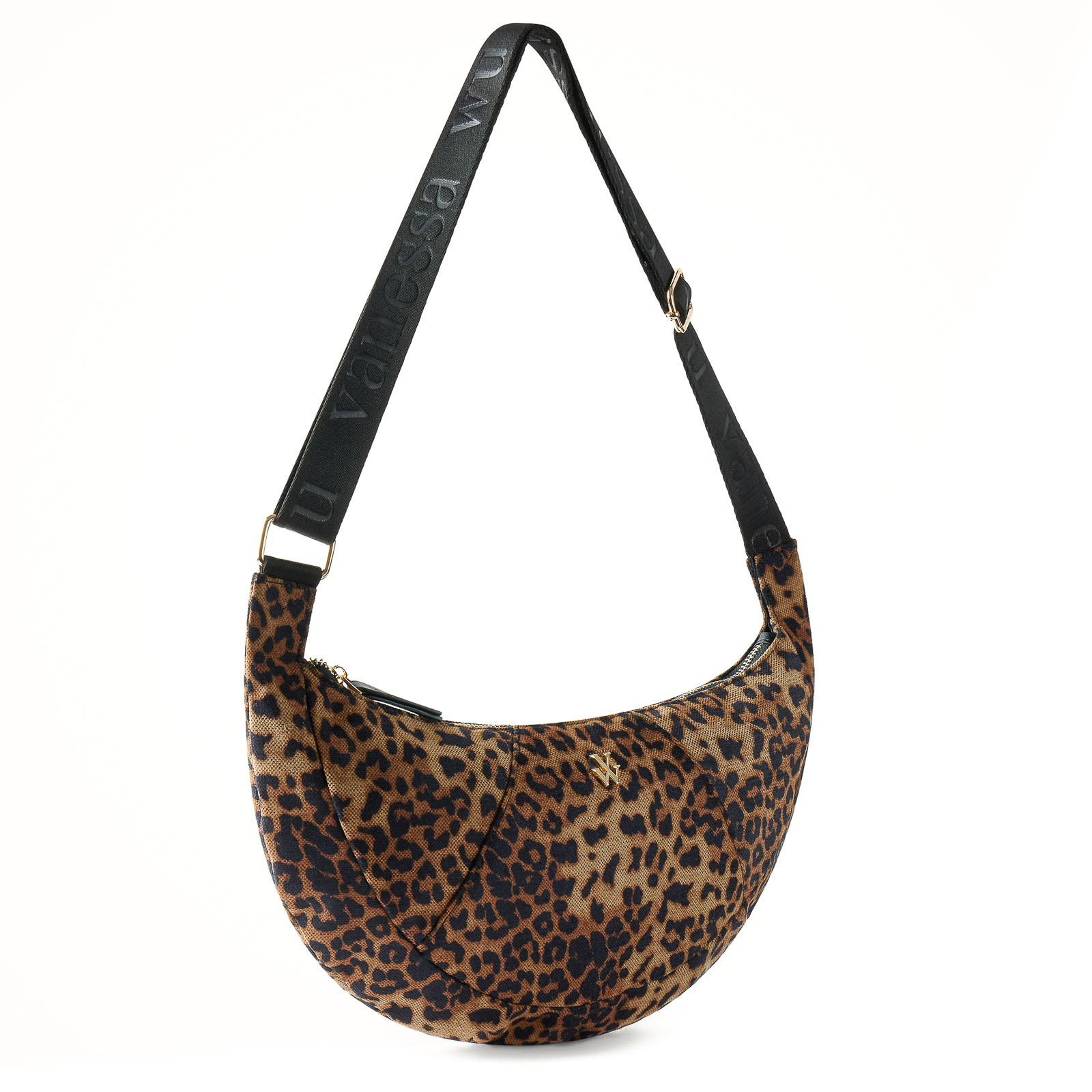 Sac Banane de la marque Vanessa Wu de couleur marron léopard. Adoptez l'élégance décontractée avec ce sac banane Flavia, un sac oversize demi-lune en tweed imprimé léopard, sublimé par des détails dorés brillants sur sa fermeture éclair et sa boucle métallique. Sa sangle ajustable en tissu noir logotypé assure un porté confortable et personnalisé, tandis que ses compartiments intérieurs (une poche ouverte, une zippée) allient fonctionnalité et sophistication. Ce sac apporte une touche de caractère audacieux et pratique à toutes vos tenues.