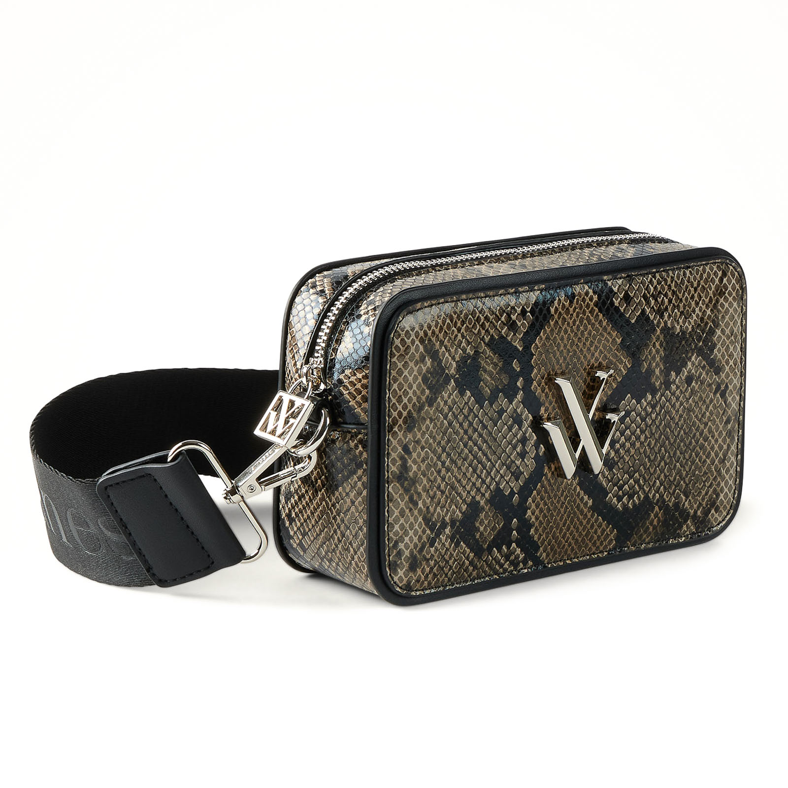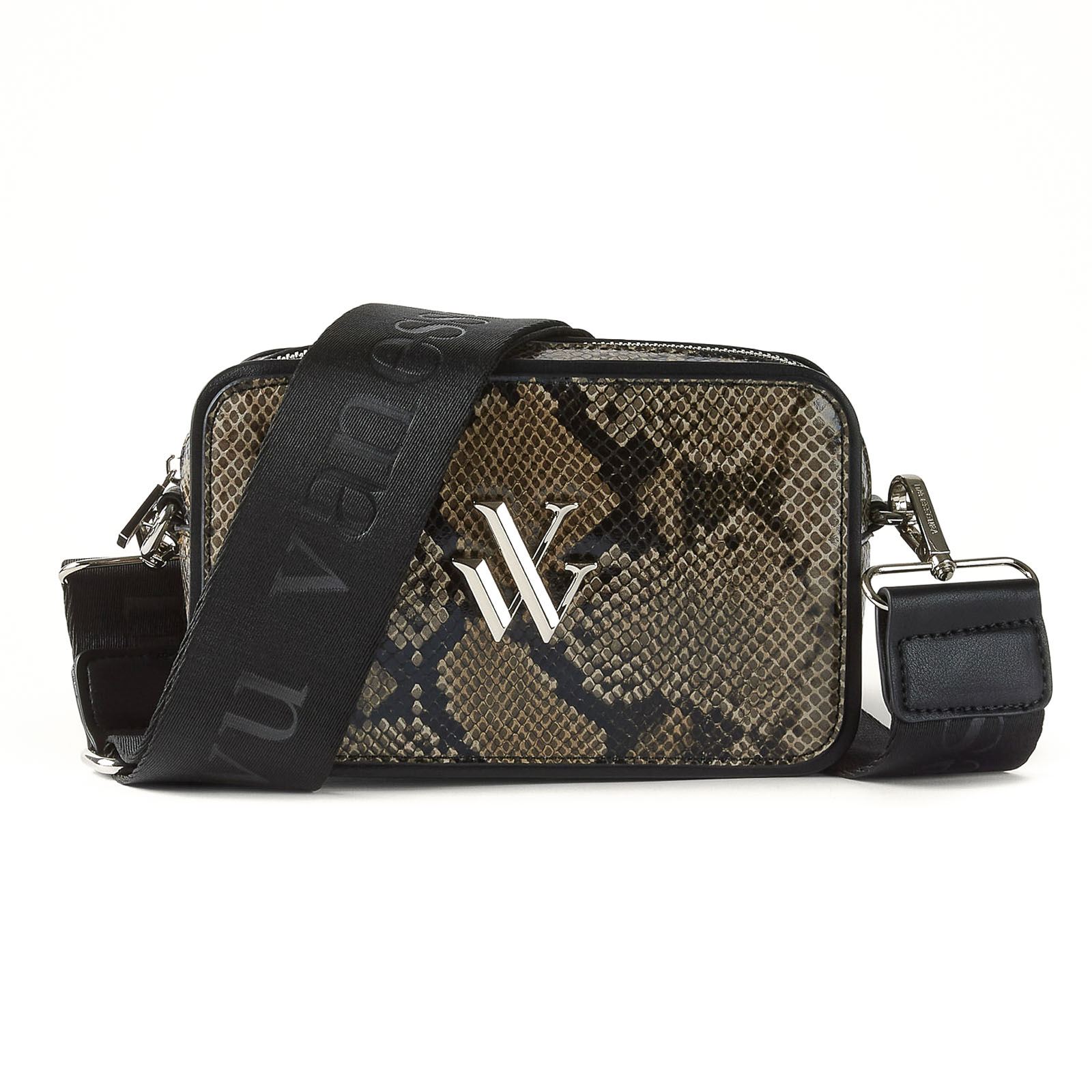 Sac À Main de la marque Vanessa Wu de couleur gris python. Joli petit sac nommé Chiara, un sac trotteur en faux shearling beige et suédine effet peau de pêche camel, insert du glamour du logo métallique doré, une bandoulière large amovible et réglable.
