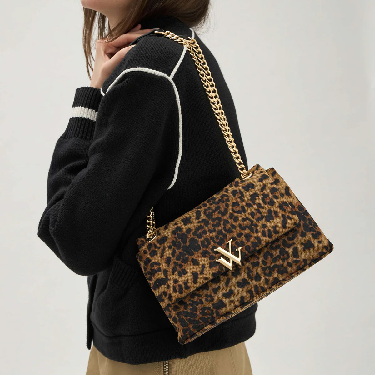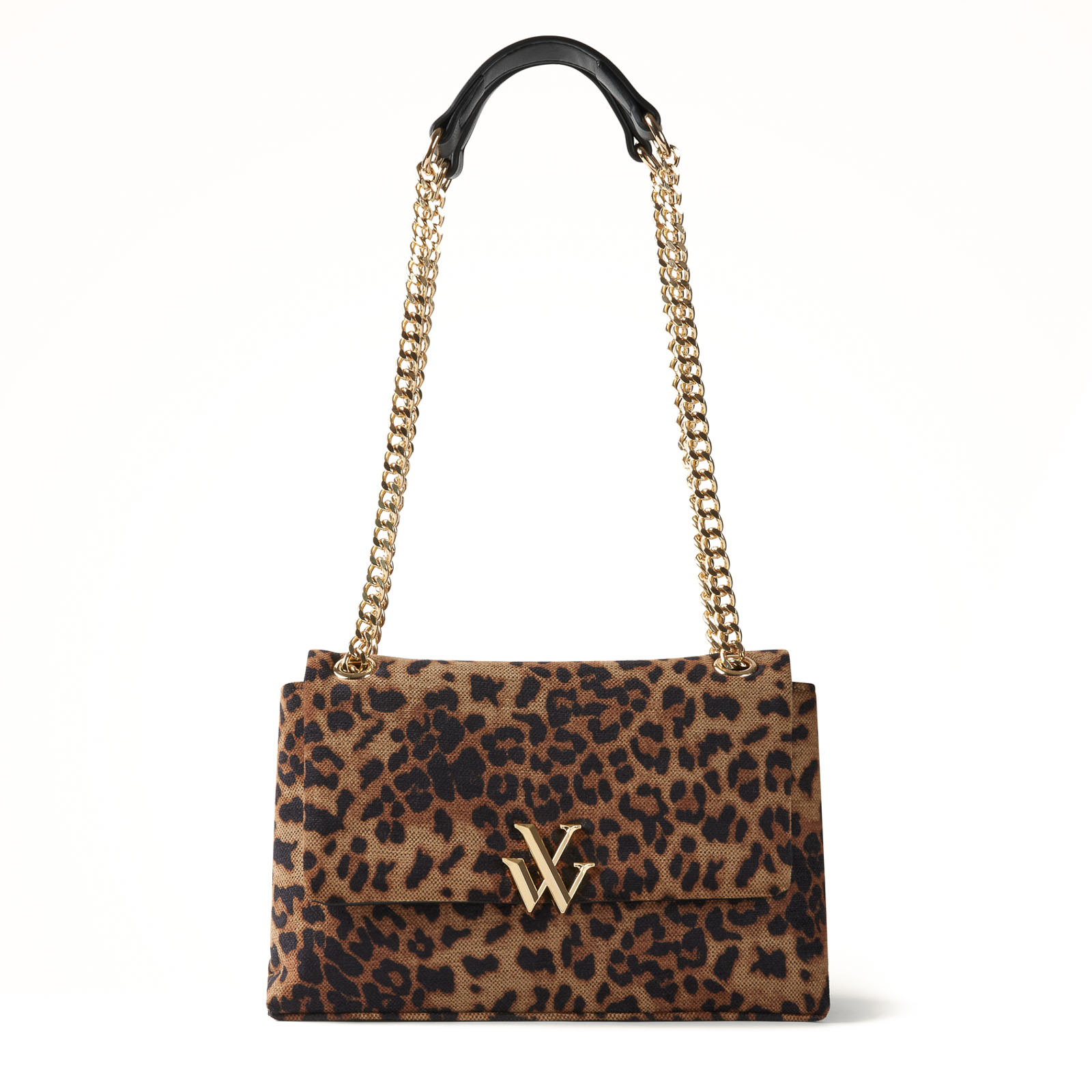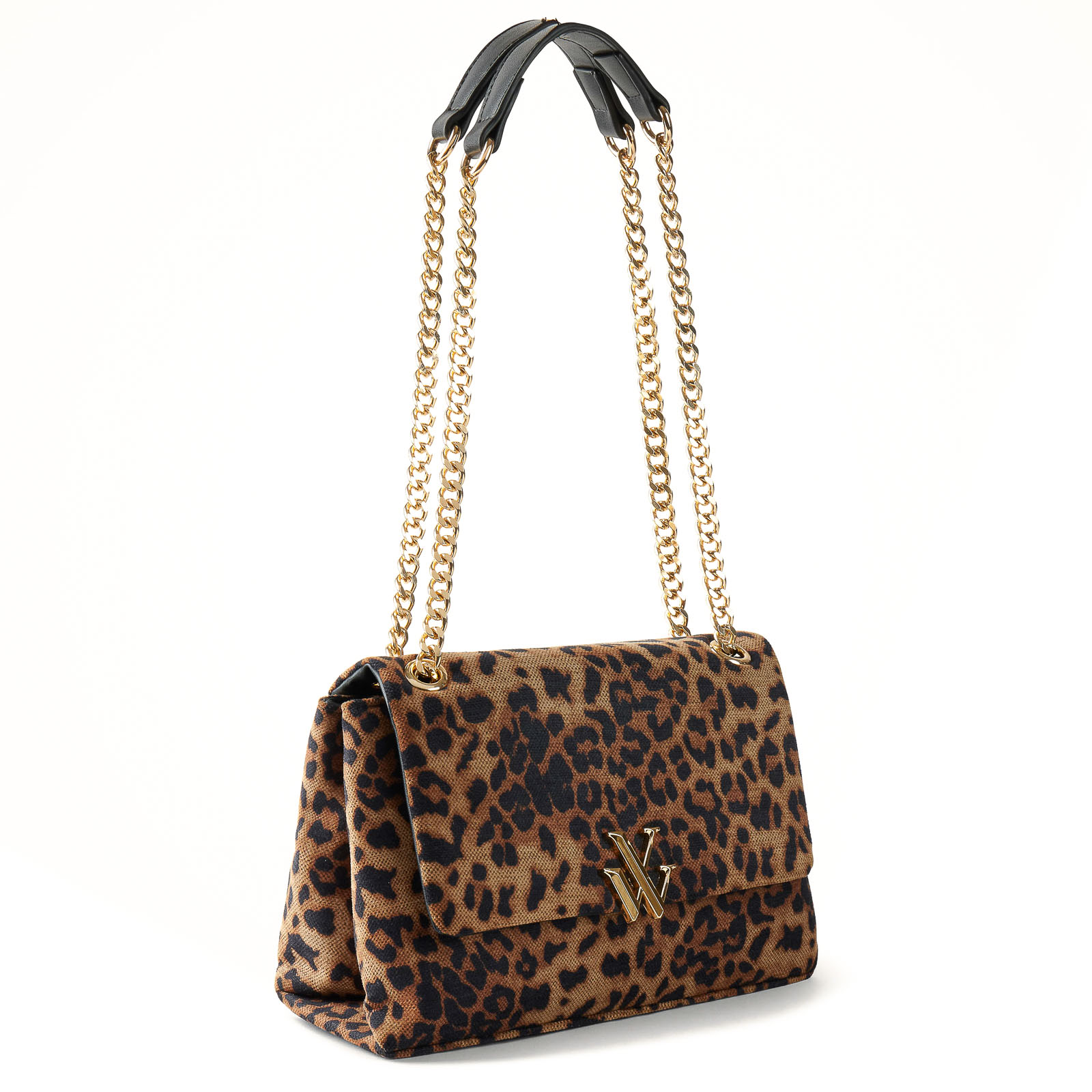 Sac À Main de la marque Vanessa Wu de couleur marron léopard. Joli Sac nommé Méline, un sac à main en tweed imprimé léopard, des anses ajustables pour un porté épaule ou en bandoulière, une fermeture à rabat avec bouton magnétique et logo or pour parfaire la touche glamour.