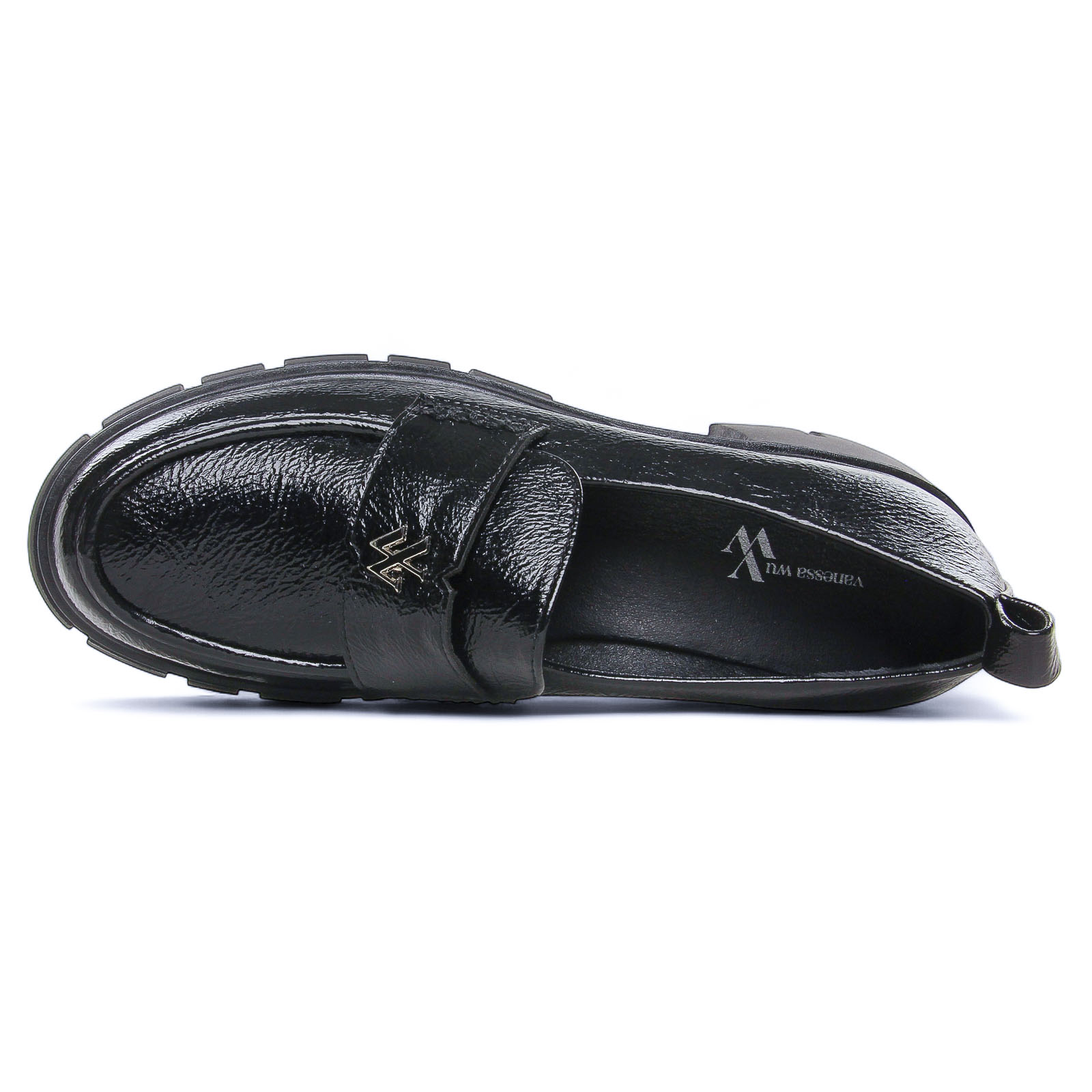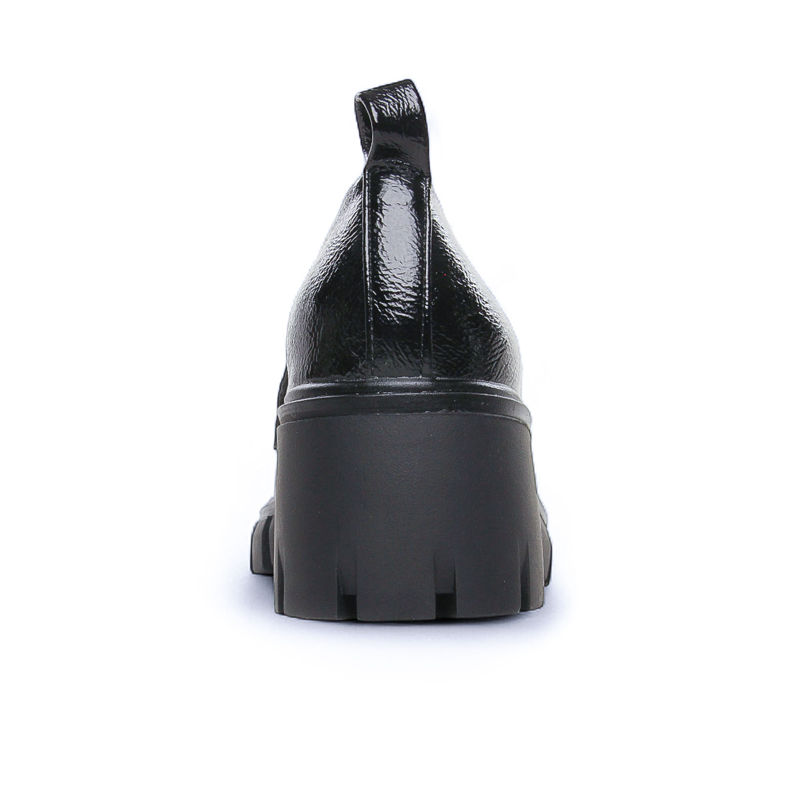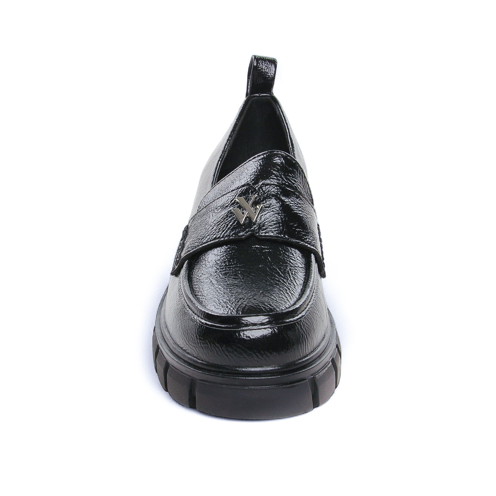 Mocassins Talon Haut de la marque Vanessa Wu de couleur noir. Un talon massif haut de 6 cm, superbes mocassins en simili cuir vernis noir, une semelle noire crantée avec un patin de 2 cm, revisite moderne du mocassin par Vanessa Wu pour sa nouvelle collection automne hiver.