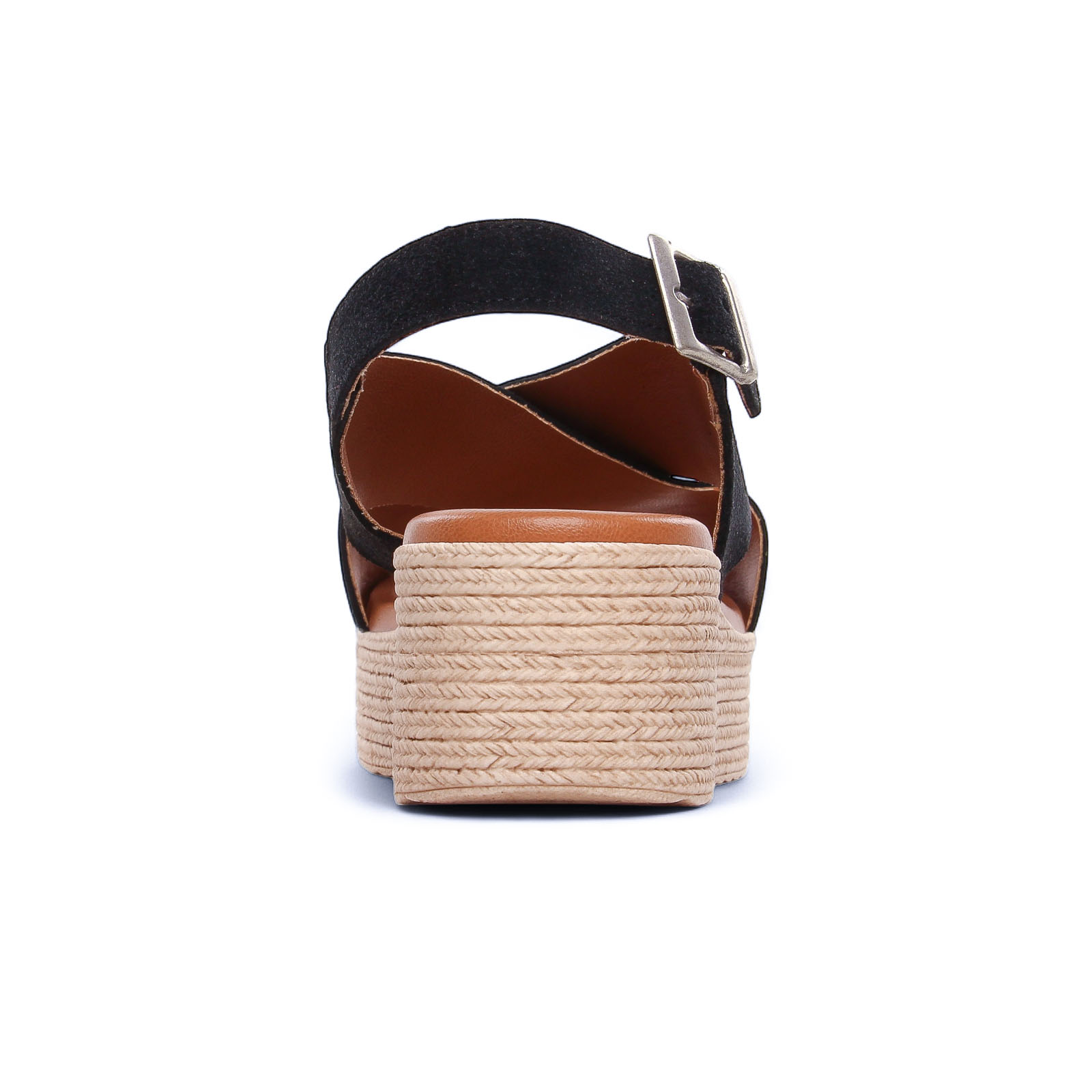 Sandales Compensées de la marque Scarlatine de couleur noir. Nu-pieds tendances et modernes avec une tige cuir noir ou impression léopard, brides larges croisées pour l'empeigne et une bride fine arrière réglage par boucle, talon compensé avec une bel effet cordes, une plateforme de3 cm à l'avant et une hauteur sous talon de 5 cm.